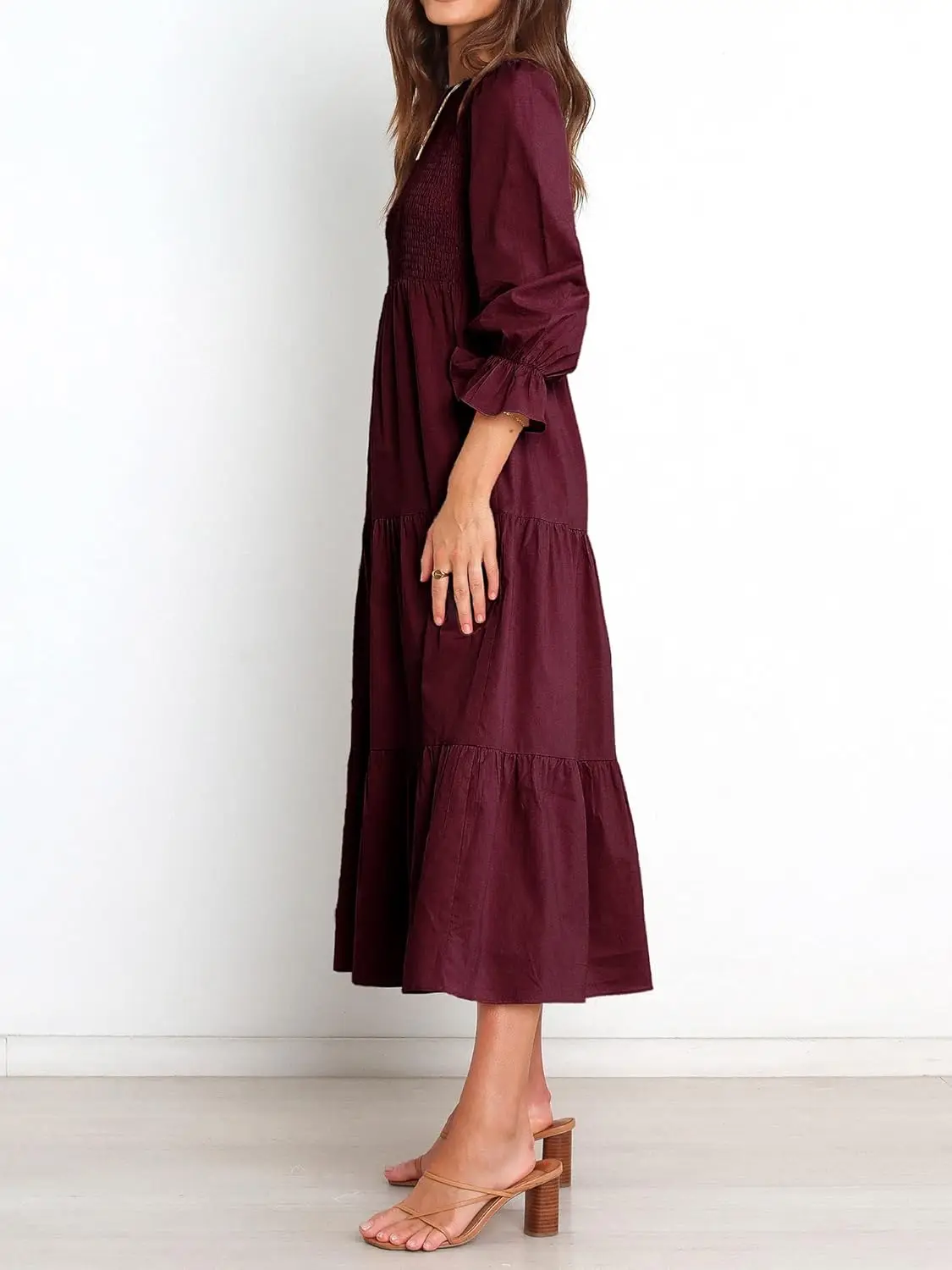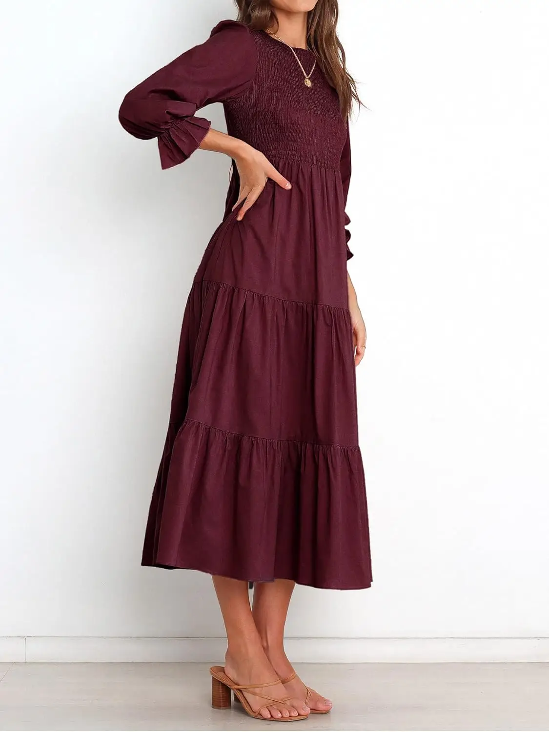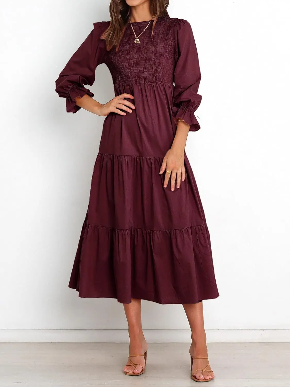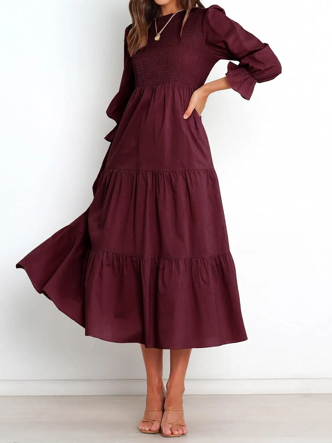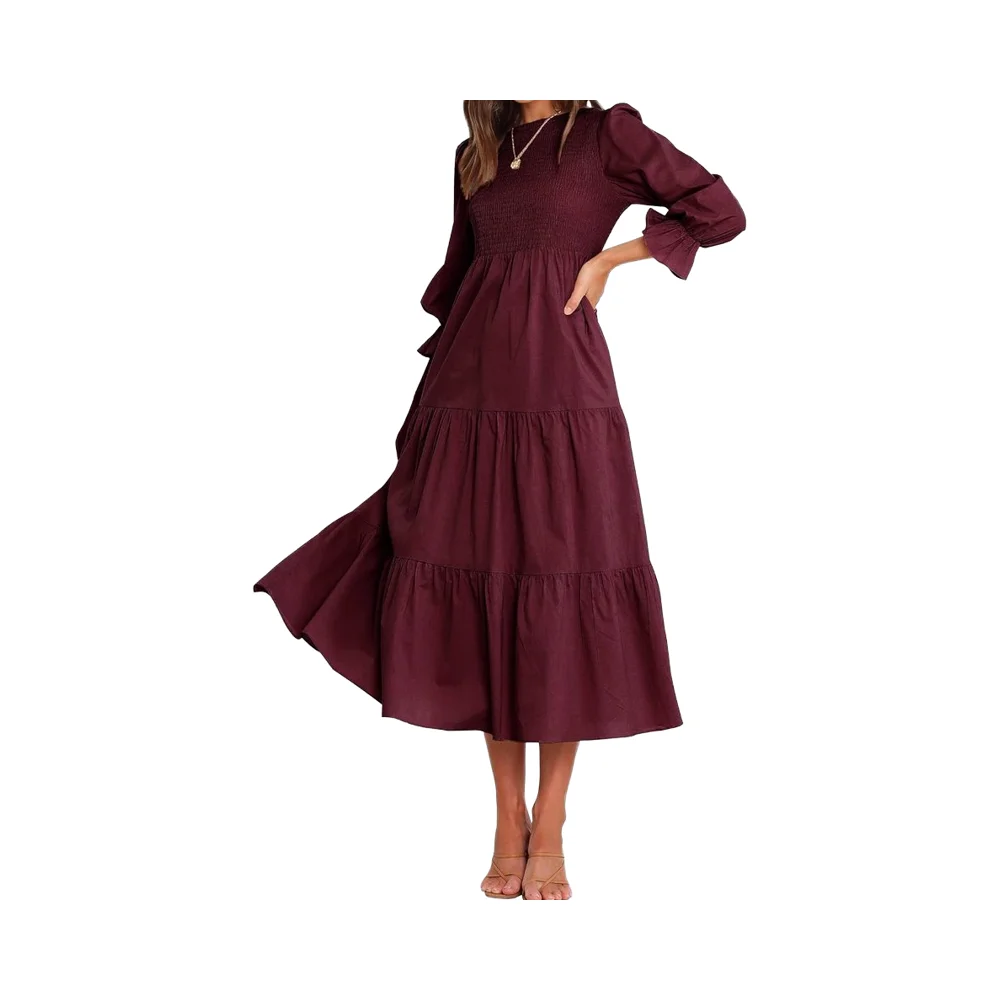 Women's Casual Long Sleeve Maxi Dress with Floral Tiered Front Crew Neck Flowy Chiffon Bohemian Relaxed Fit Natural Color